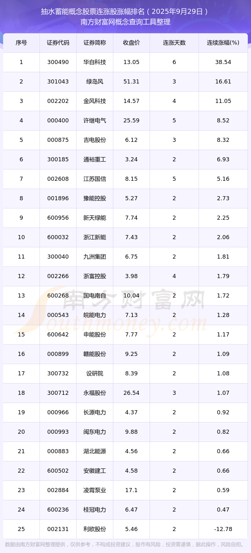 2025年9月29日抽水蓄能概念股票連漲股漲幅排名