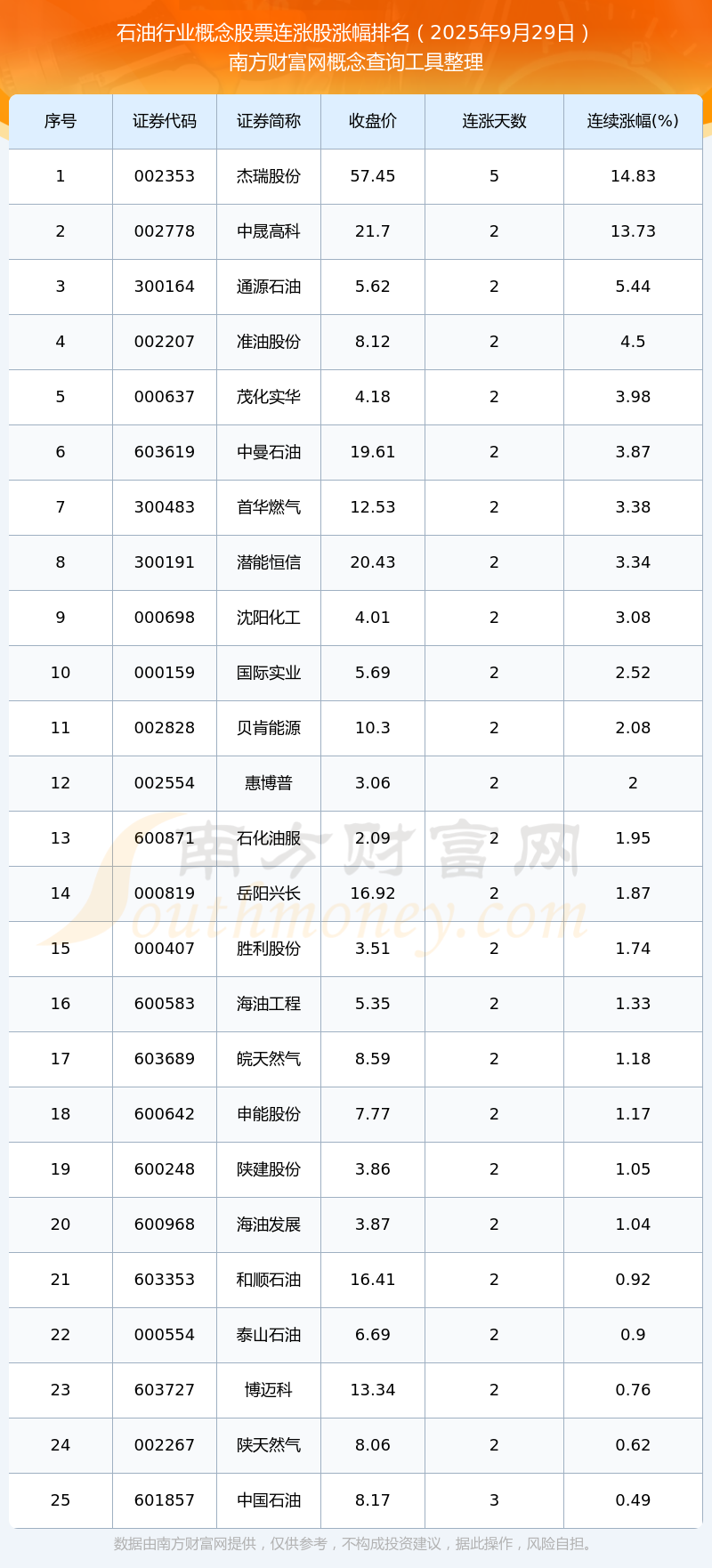 2025年9月29日石油行業(yè)概念股票連漲股漲幅排名