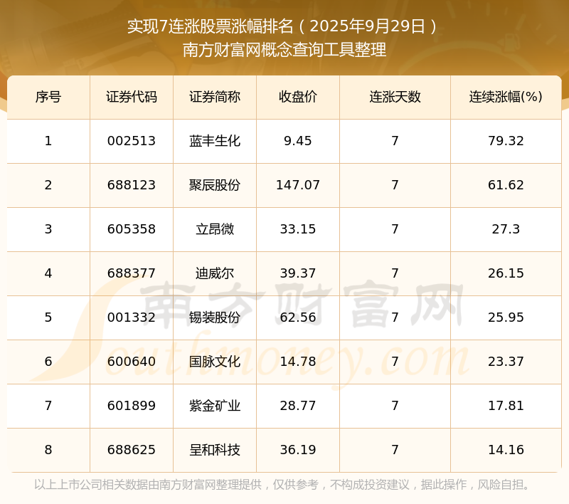 2025年9月29日實(shí)現(xiàn)7連漲股票漲幅排名