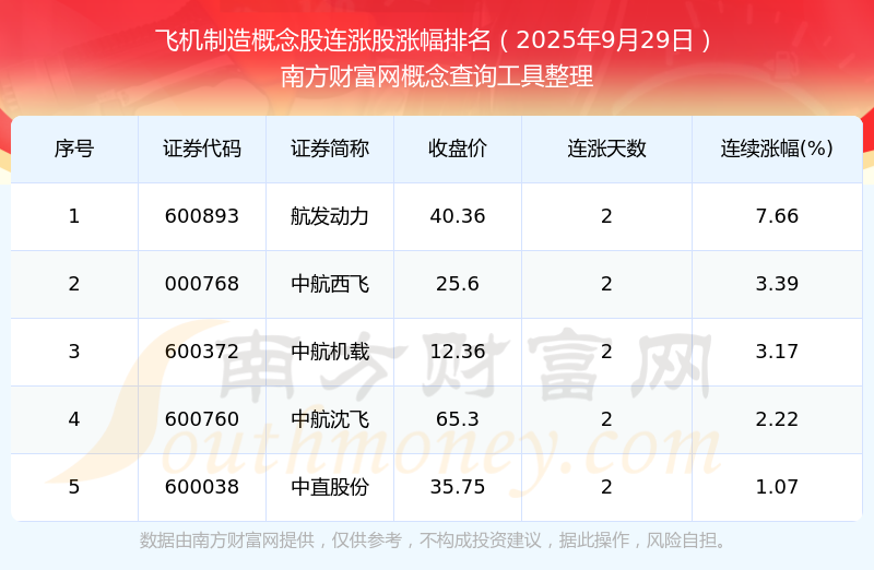 根據(jù)南方財(cái)富網(wǎng)概念查詢工具數(shù)據(jù)統(tǒng)計(jì),截止2025年9月29日收盤,飛機(jī)制造概念股共有5只個(gè)股實(shí)現(xiàn)連漲。其中連續(xù)漲幅較大的個(gè)股有航發(fā)動(dòng)力、中航西飛、中航機(jī)載等,連續(xù)漲幅分別為7.66%、3.39%、3.17%。