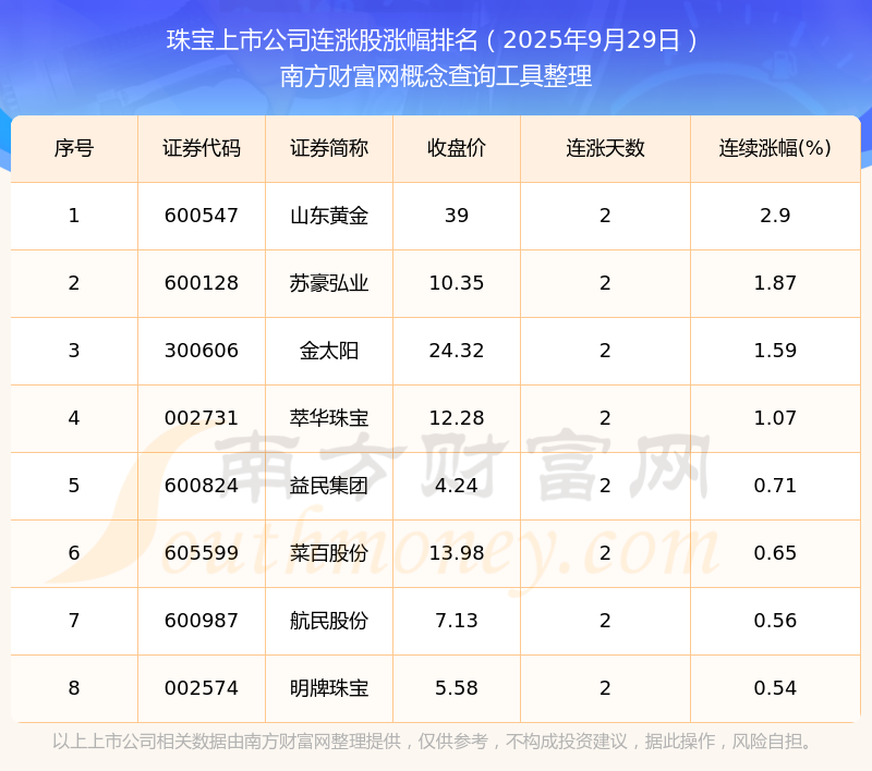 根據(jù)南方財富網(wǎng)概念查詢工具數(shù)據(jù)統(tǒng)計,截止2025年9月29日收盤,珠寶上市公司共有8只個股實現(xiàn)連漲。其中連續(xù)漲幅較大的個股有山東黃金、蘇豪弘業(yè)、金太陽等,連續(xù)漲幅分別為2.90%、1.87%、1.59%。