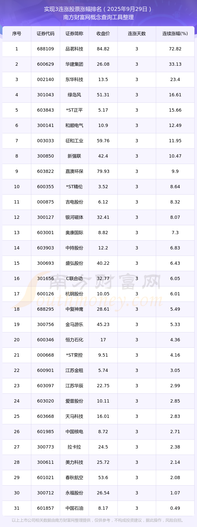 2025年9月29日實(shí)現(xiàn)3連漲股票漲幅排名