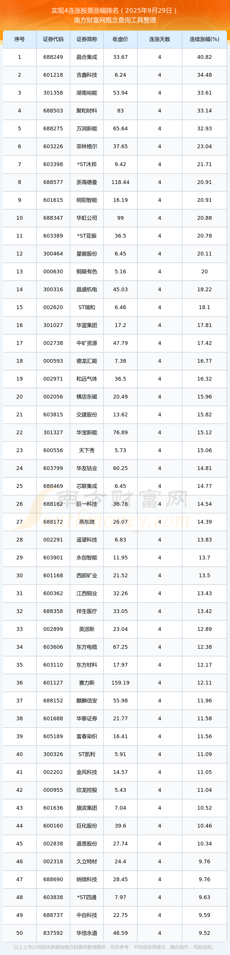 2025年9月29日實(shí)現(xiàn)4連漲股票漲幅排名