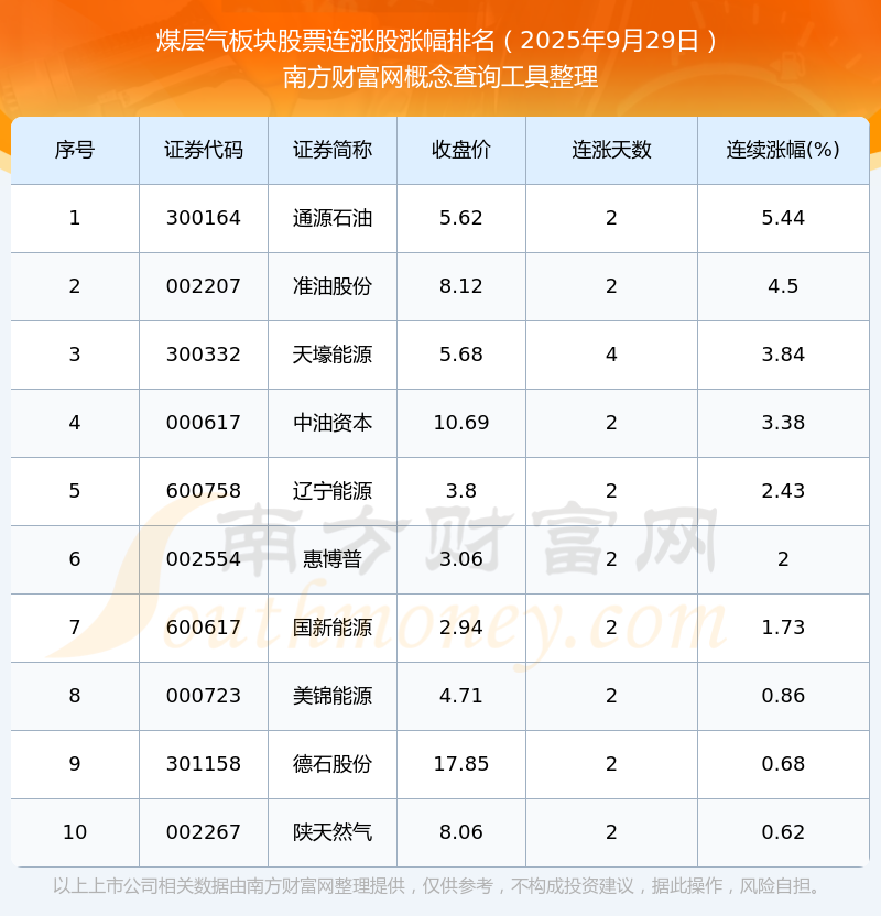 2025年9月29日煤層氣板塊股票連漲股漲幅排名