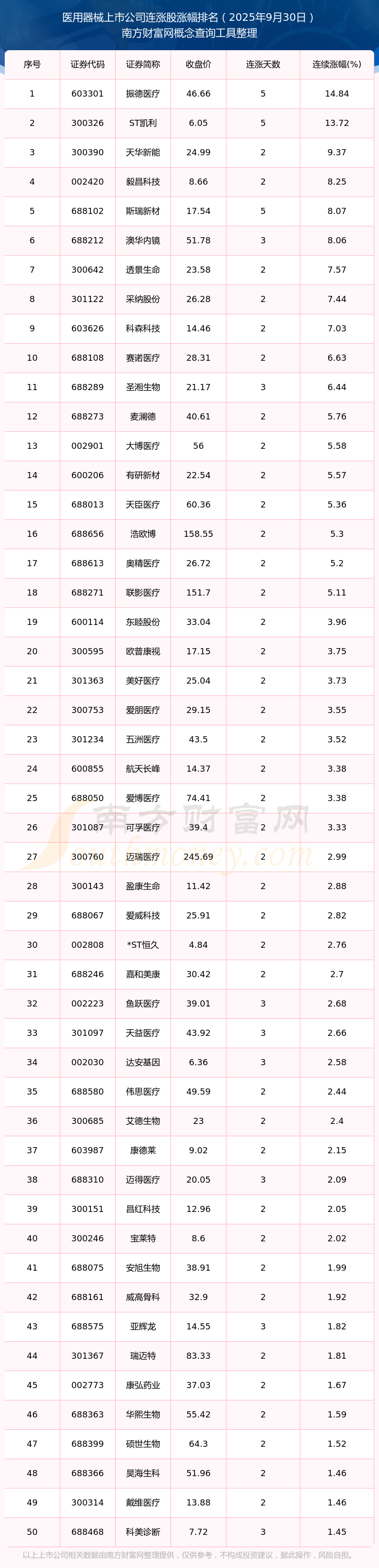 2025年9月30日醫(yī)用器械上市公司連漲股漲幅排名