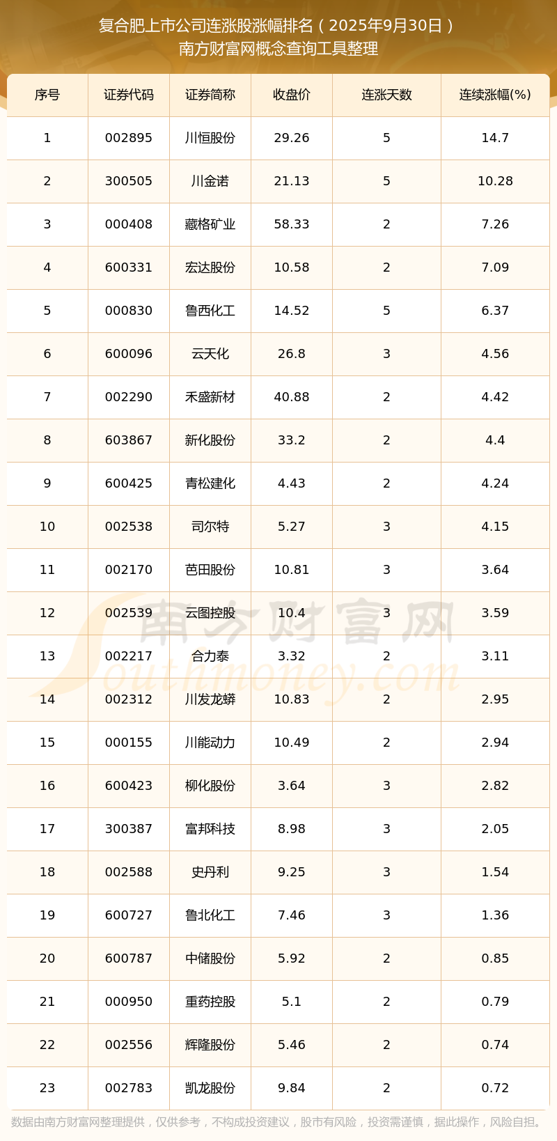 2025年9月30日復(fù)合肥上市公司連漲股漲幅排名