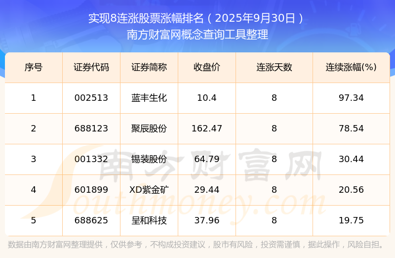 2025年9月30日實(shí)現(xiàn)8連漲股票漲幅排名
