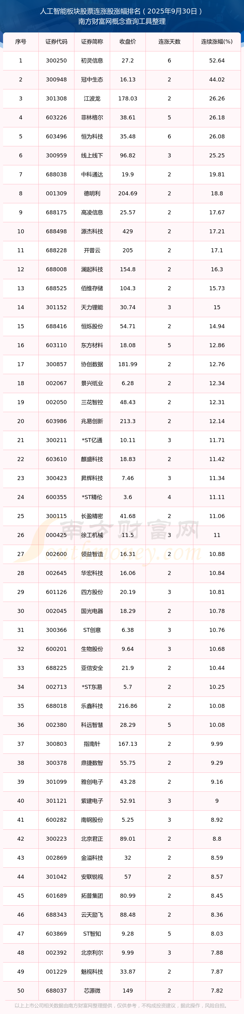 2025年9月30日人工智能板塊股票連漲股漲幅排名
