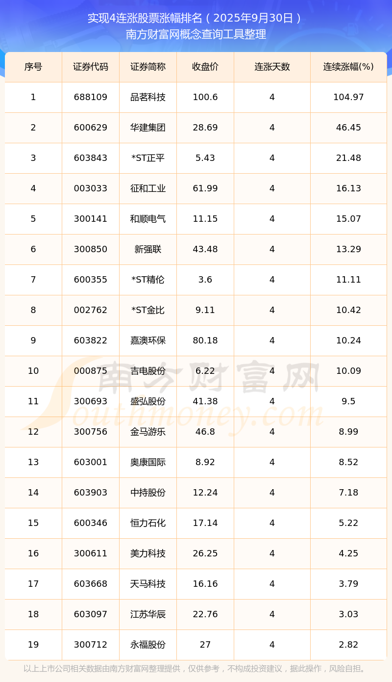 根據(jù)南方財(cái)富網(wǎng)概念查詢工具數(shù)據(jù)統(tǒng)計(jì),截止2025年9月30日收盤,共有19只個(gè)股實(shí)現(xiàn)4天連漲。其中連續(xù)漲幅較大的個(gè)股有品茗科技、華建集團(tuán)、*ST正平等,連續(xù)漲幅分別為104.97%、46.45%、21.48%。