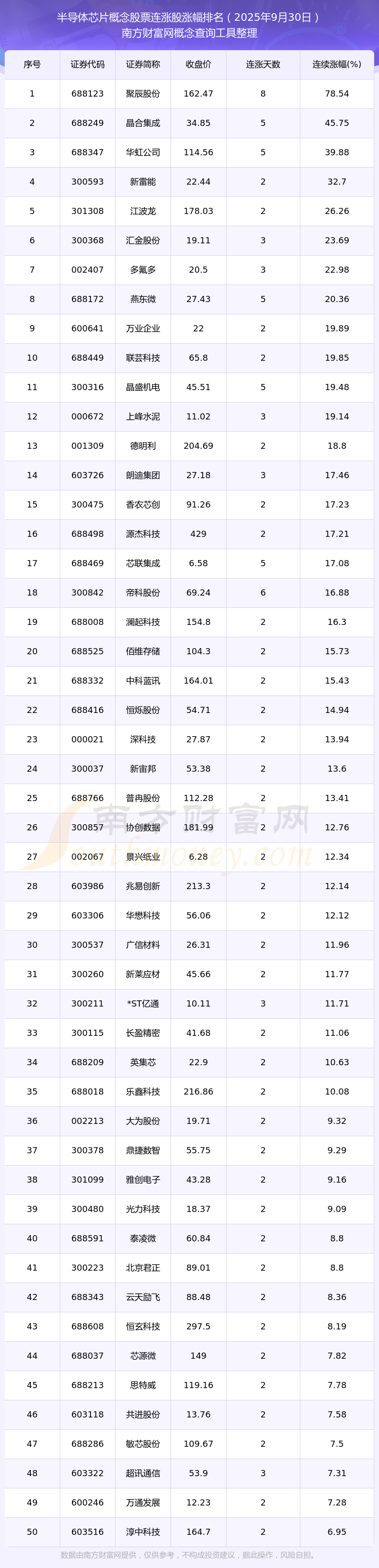 2025年9月30日半導(dǎo)體芯片概念股票連漲股漲幅排名