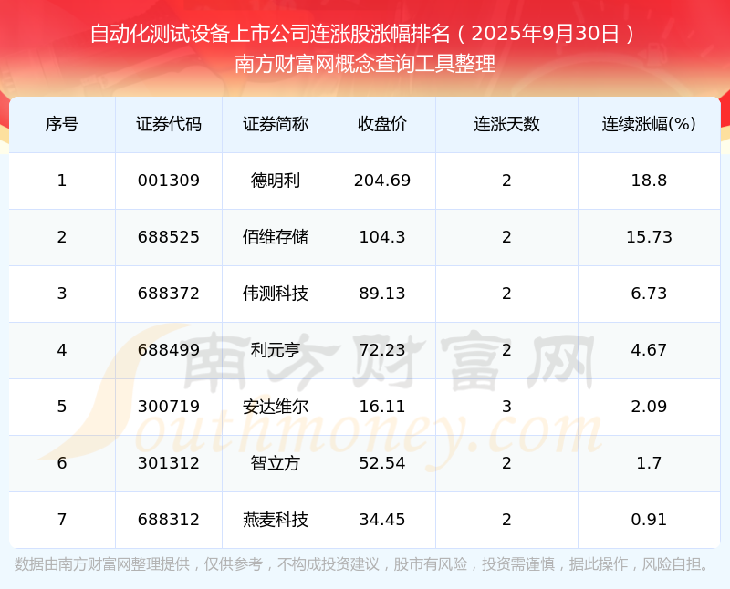 2025年9月30日自動(dòng)化測(cè)試設(shè)備上市公司連漲股漲幅排名