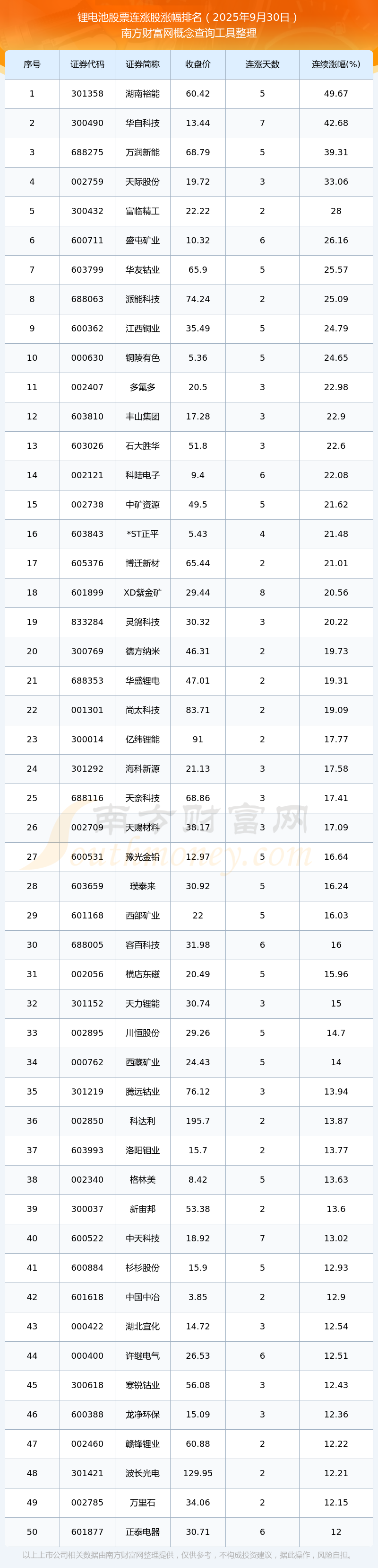 2025年9月30日鋰電池股票連漲股漲幅排名