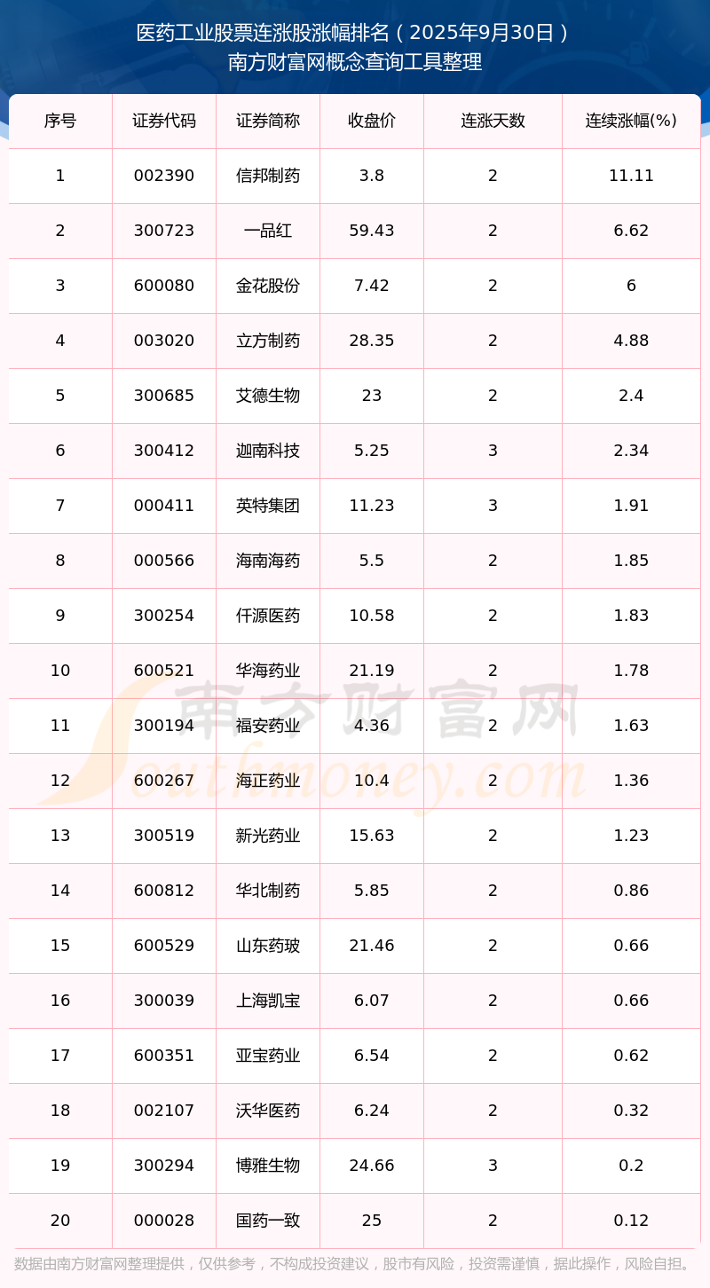 2025年9月30日醫(yī)藥工業(yè)股票連漲股漲幅排名