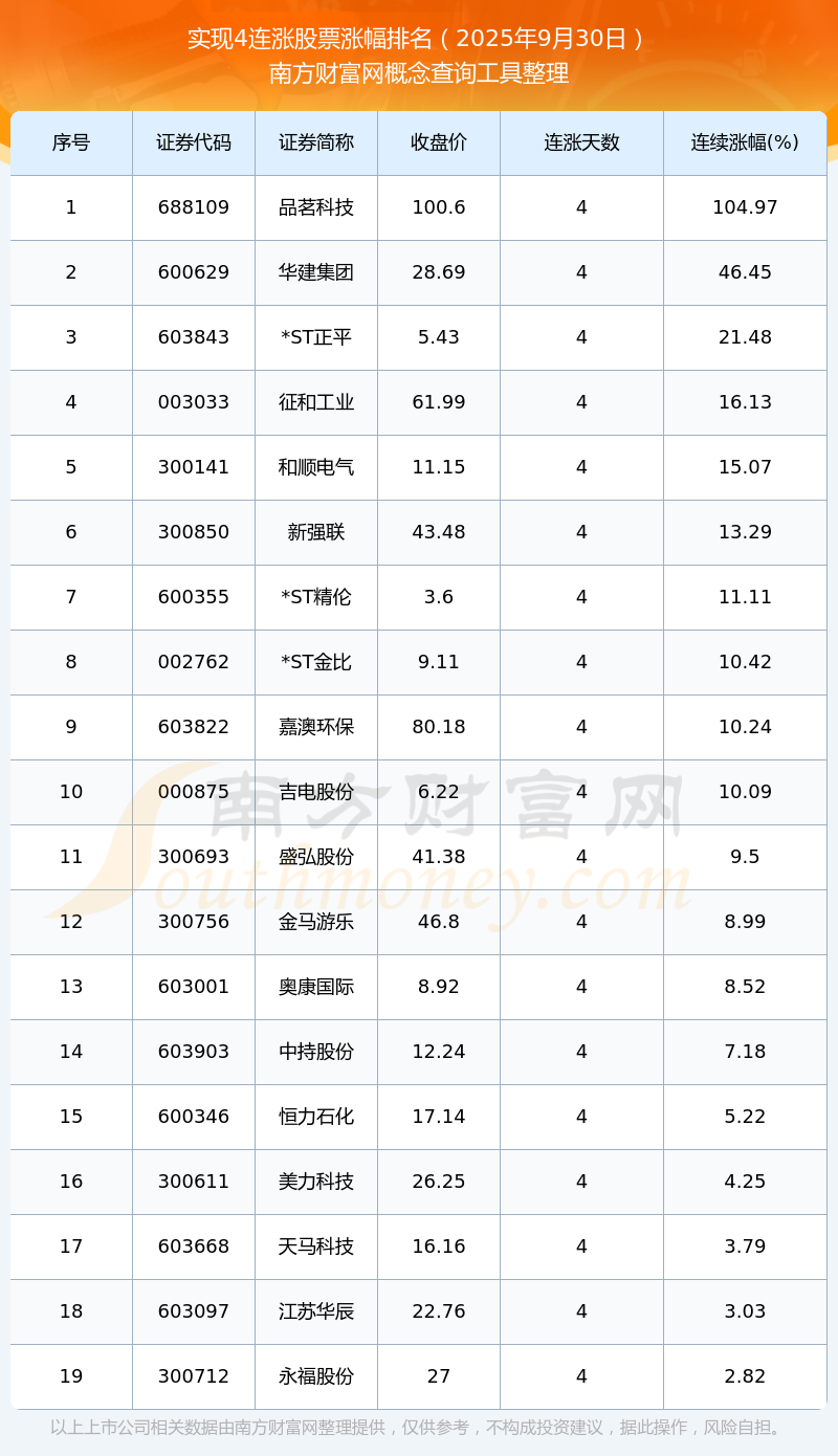 2025年9月30日實(shí)現(xiàn)4連漲股票漲幅排名