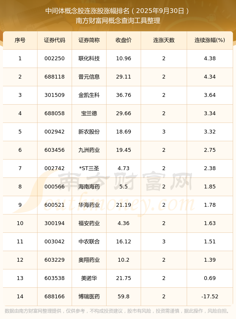 根據(jù)南方財富網(wǎng)概念查詢工具數(shù)據(jù)統(tǒng)計,截止2025年9月30日收盤,中間體概念股共有14只個股實現(xiàn)連漲。其中連續(xù)漲幅較大的個股有聯(lián)化科技、普元信息、金凱生科等,連續(xù)漲幅分別為4.38%、4.34%、3.64%。