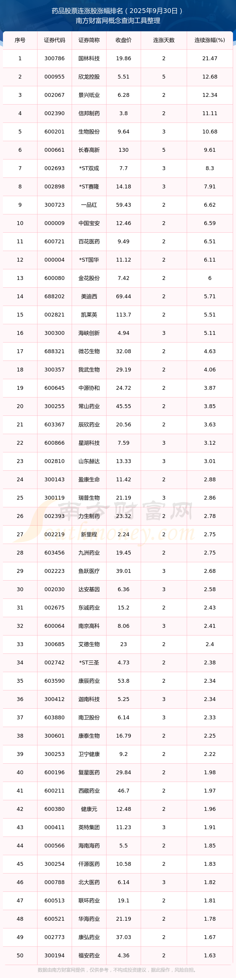 2025年9月30日藥品股票連漲股漲幅排名