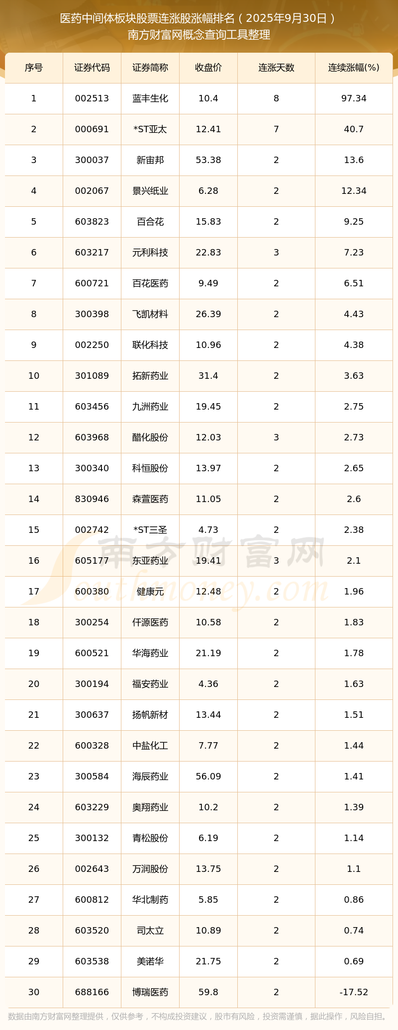 2025年9月30日醫(yī)藥中間體板塊股票連漲股漲幅排名