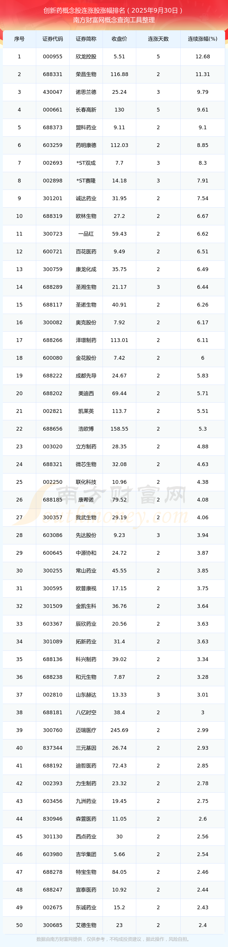 2025年9月30日創(chuàng)新藥概念股連漲股漲幅排名
