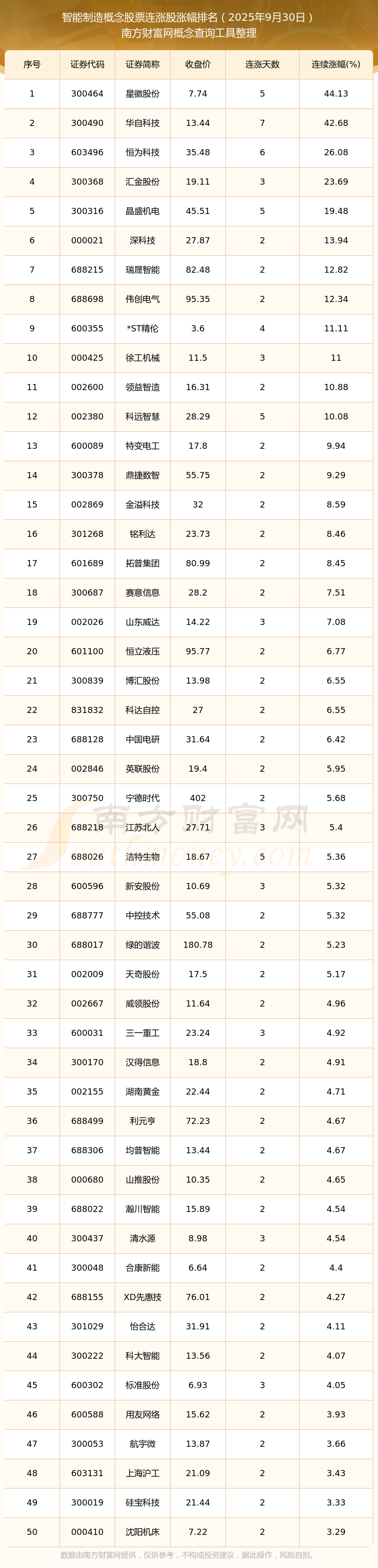2025年9月30日智能制造概念股票連漲股漲幅排名