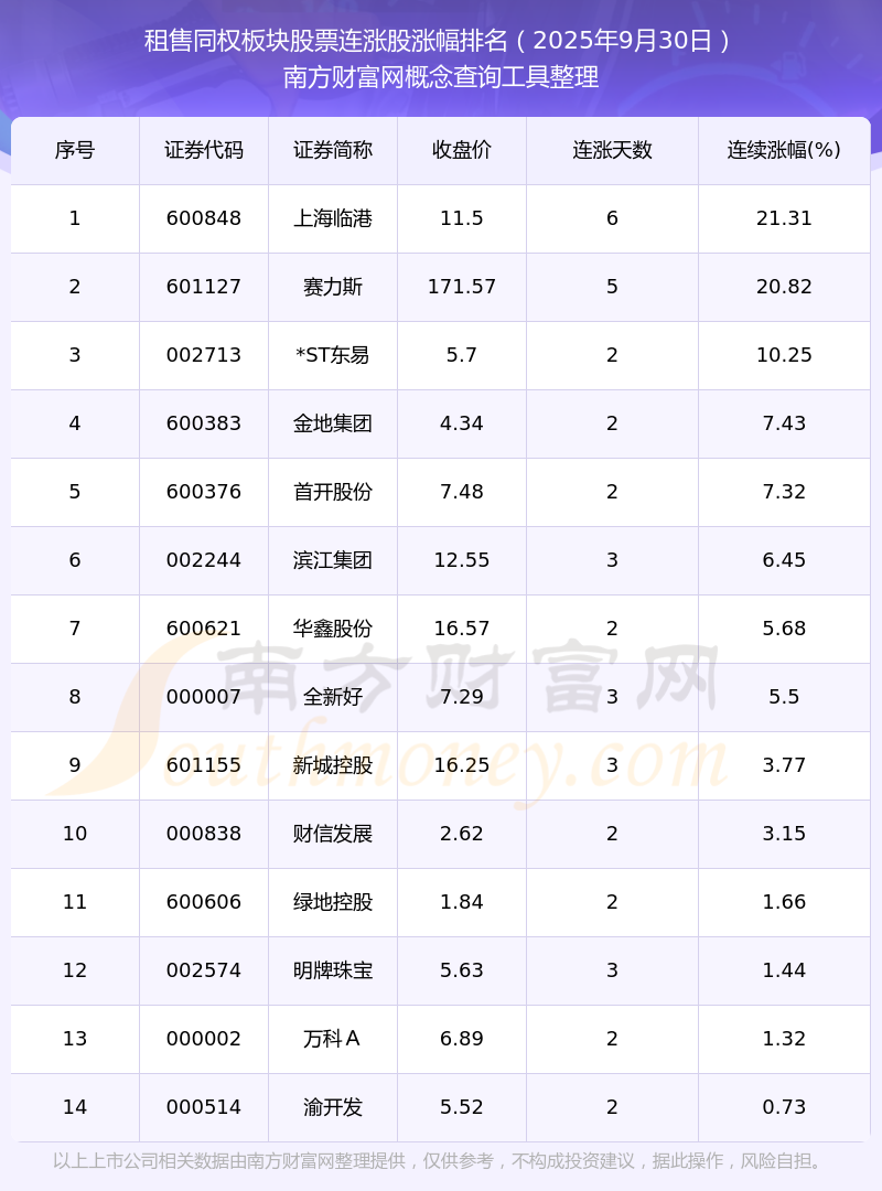 2025年9月30日租售同權(quán)板塊股票連漲股漲幅排名