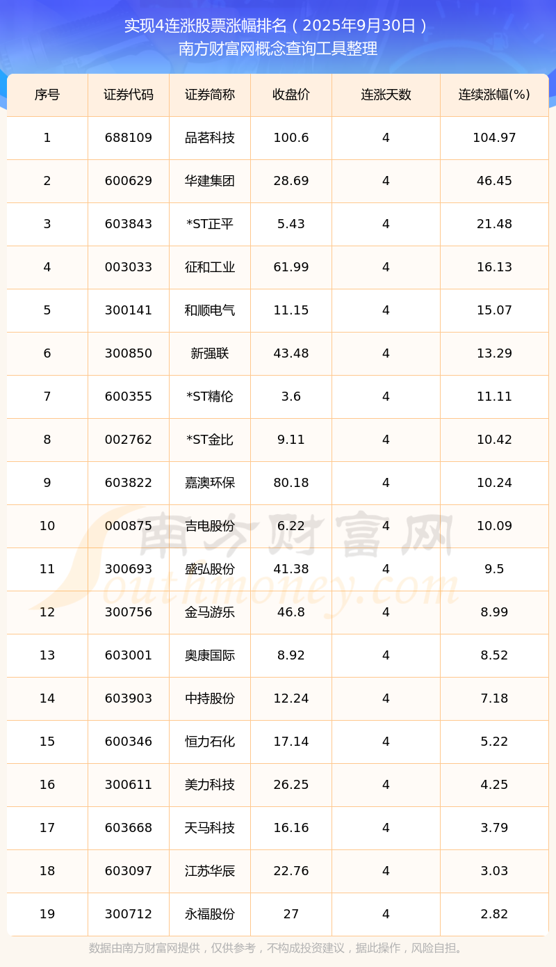 2025年9月30日實(shí)現(xiàn)4連漲股票漲幅排名