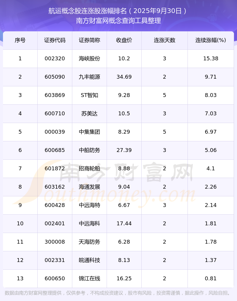 根據(jù)南方財富網(wǎng)概念查詢工具數(shù)據(jù)統(tǒng)計,截止2025年9月30日收盤,航運概念股共有13只個股實現(xiàn)連漲。其中連續(xù)漲幅較大的個股有海峽股份、九豐能源、ST智知等,連續(xù)漲幅分別為15.38%、9.71%、8.03%。