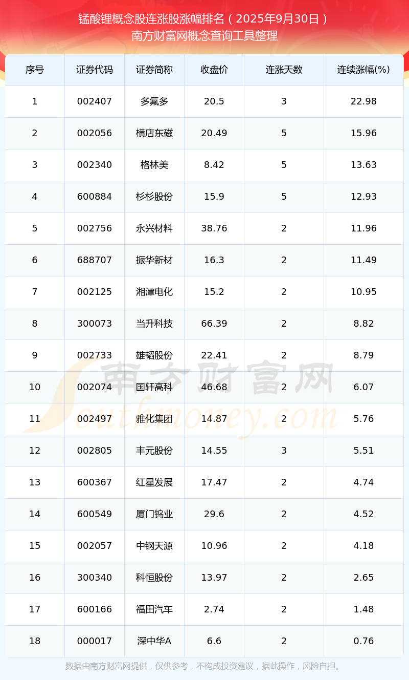 根據(jù)南方財(cái)富網(wǎng)概念查詢工具數(shù)據(jù)統(tǒng)計(jì),截止2025年9月30日收盤,錳酸鋰概念股共有18只個(gè)股實(shí)現(xiàn)連漲。其中連續(xù)漲幅較大的個(gè)股有多氟多、橫店?yáng)|磁、格林美等,連續(xù)漲幅分別為22.98%、15.96%、13.63%。