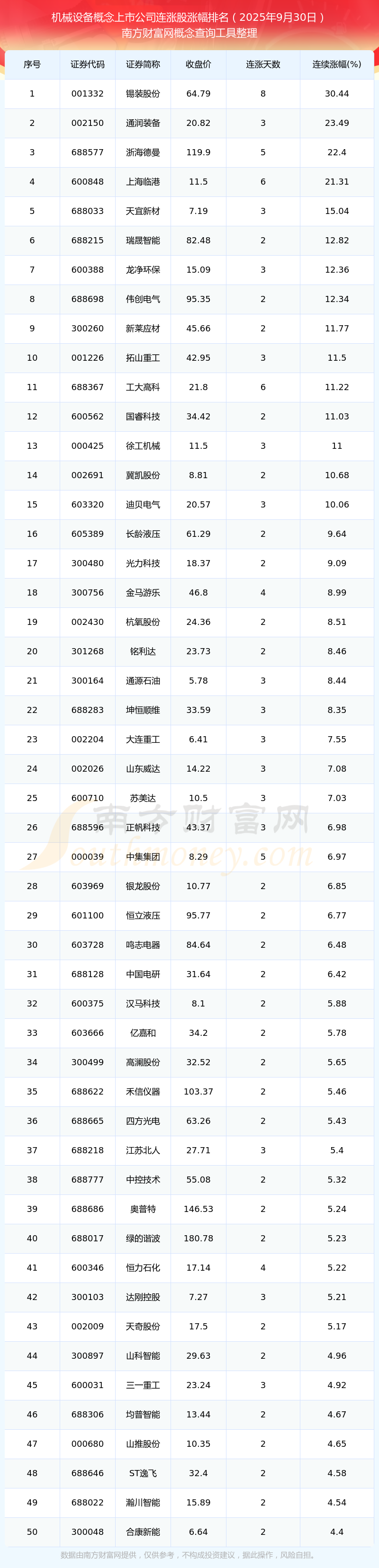 2025年9月30日機(jī)械設(shè)備概念上市公司連漲股漲幅排名