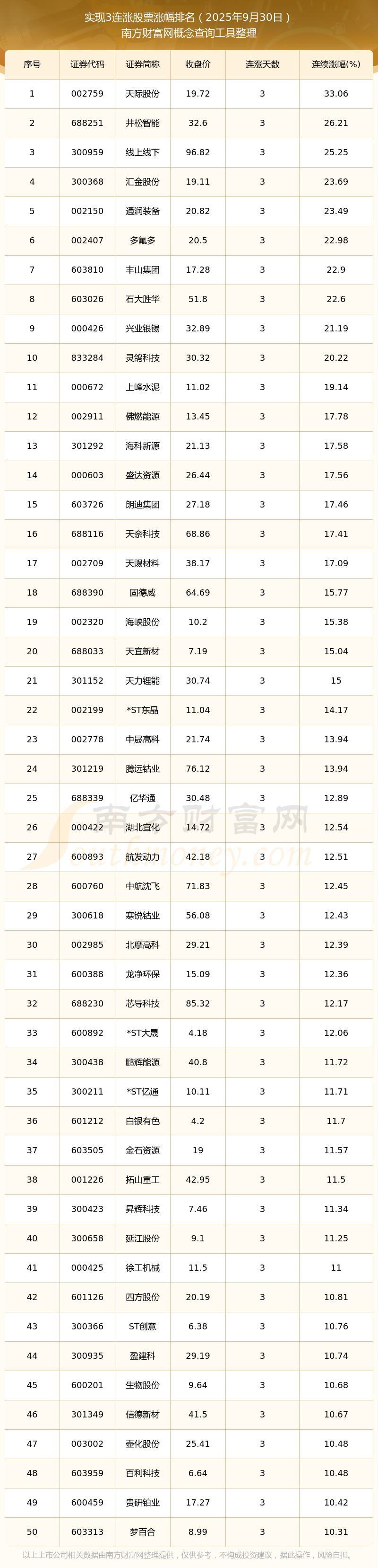 2025年9月30日實(shí)現(xiàn)3連漲股票漲幅排名
