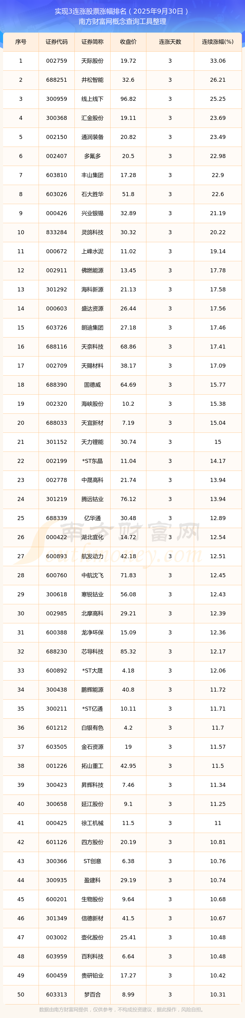 2025年9月30日實現(xiàn)3連漲股票漲幅排名