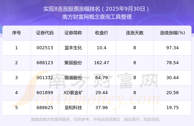 2025年9月30日實(shí)現(xiàn)8連漲股票漲幅排名