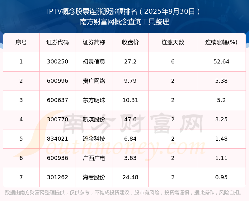 2025年9月30日IPTV概念股票連漲股漲幅排名