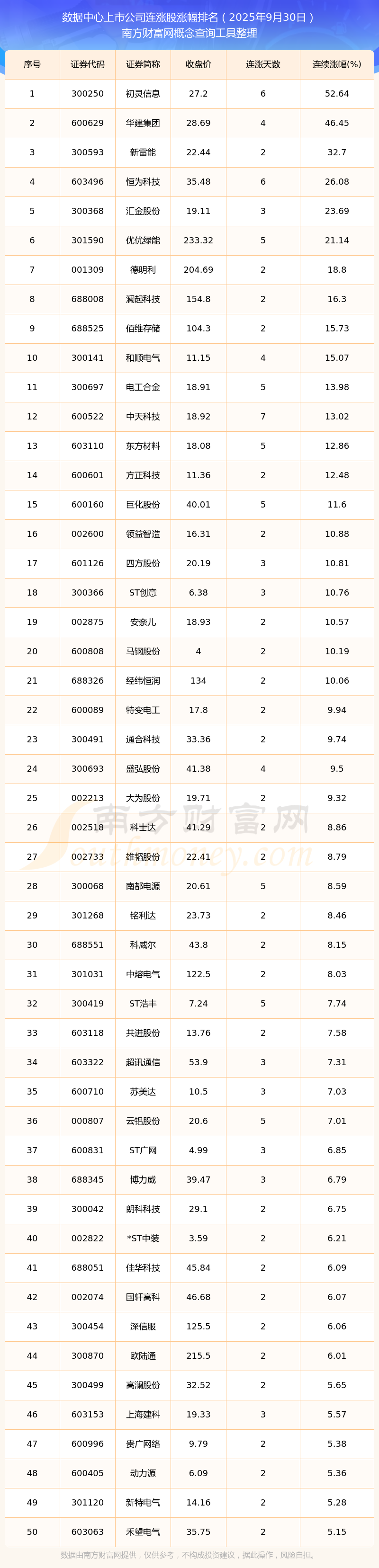 2025年9月30日數(shù)據(jù)中心上市公司連漲股漲幅排名