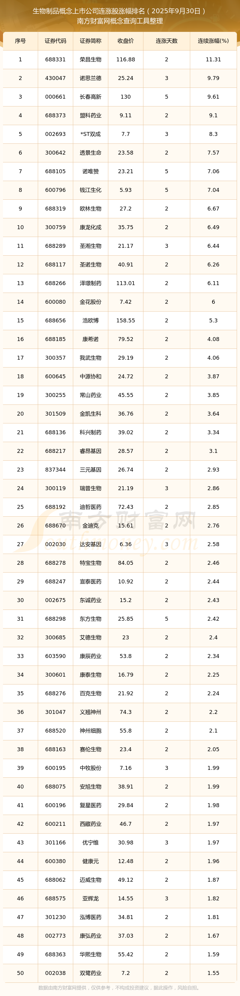 2025年9月30日生物制品概念上市公司連漲股漲幅排名