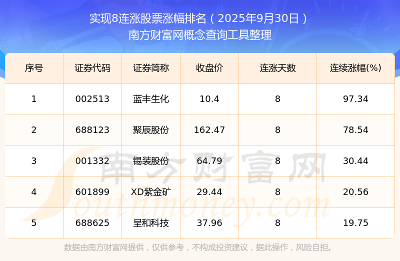 根據(jù)南方財富網(wǎng)概念查詢工具數(shù)據(jù)統(tǒng)計,截止2025年9月30日收盤,共有5只個股實現(xiàn)8天連漲。其中連續(xù)漲幅較大的個股有藍豐生化、聚辰股份、錫裝股份等,連續(xù)漲幅分別為97.34%、78.54%、30.44%。
