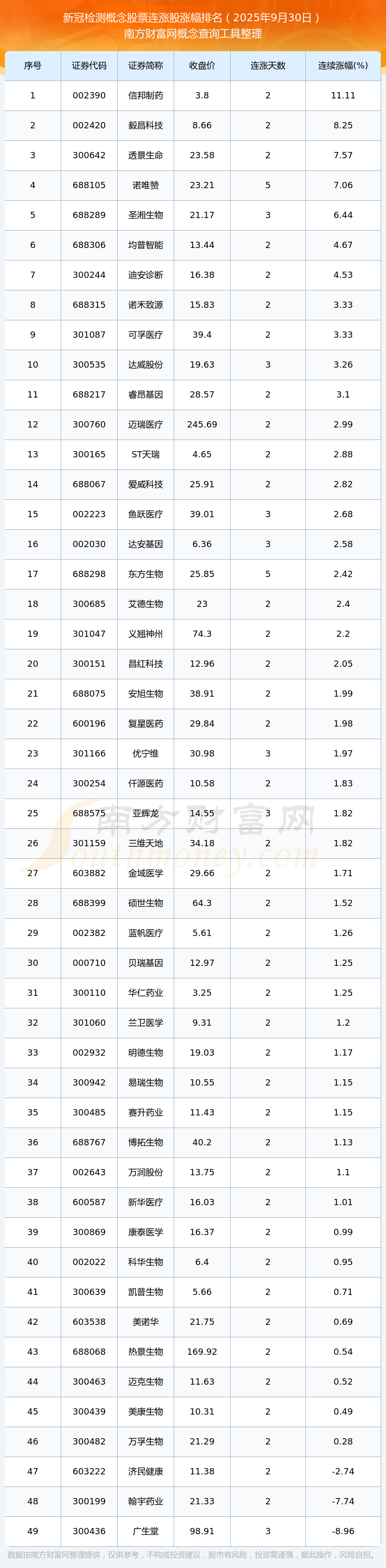 2025年9月30日新冠檢測(cè)概念股票連漲股漲幅排名