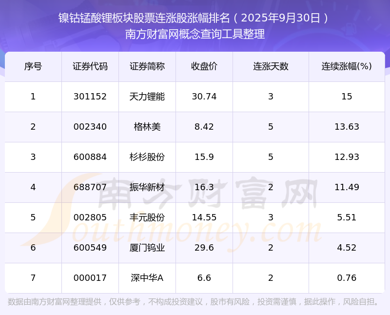 2025年9月30日鎳鈷錳酸鋰板塊股票連漲股漲幅排名