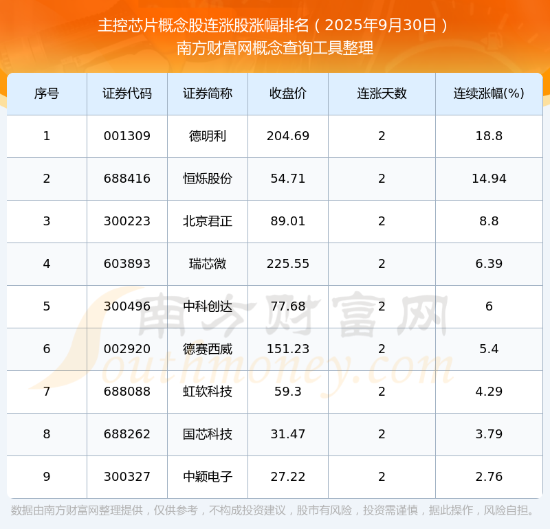 根據(jù)南方財富網(wǎng)概念查詢工具數(shù)據(jù)統(tǒng)計,截止2025年9月30日收盤,主控芯片概念股共有9只個股實現(xiàn)連漲。其中連續(xù)漲幅較大的個股有德明利、恒爍股份、北京君正等,連續(xù)漲幅分別為18.80%、14.94%、8.80%。