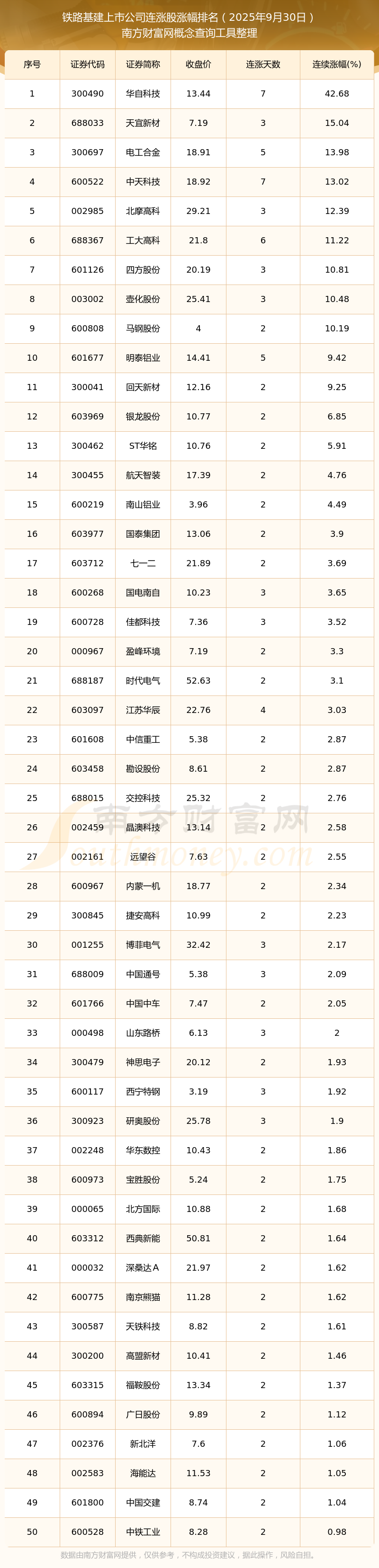 根據(jù)南方財富網(wǎng)概念查詢工具數(shù)據(jù)統(tǒng)計,截止2025年9月30日收盤,鐵路基建上市公司共有56只個股實(shí)現(xiàn)連漲。其中連續(xù)漲幅較大的個股有華自科技、天宜新材、電工合金等,連續(xù)漲幅分別為42.68%、15.04%、13.98%。