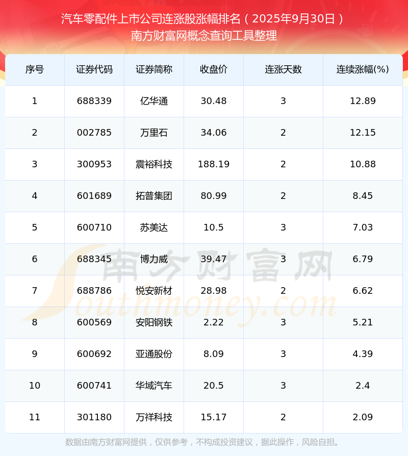 2025年9月30日汽車零配件上市公司連漲股漲幅排名