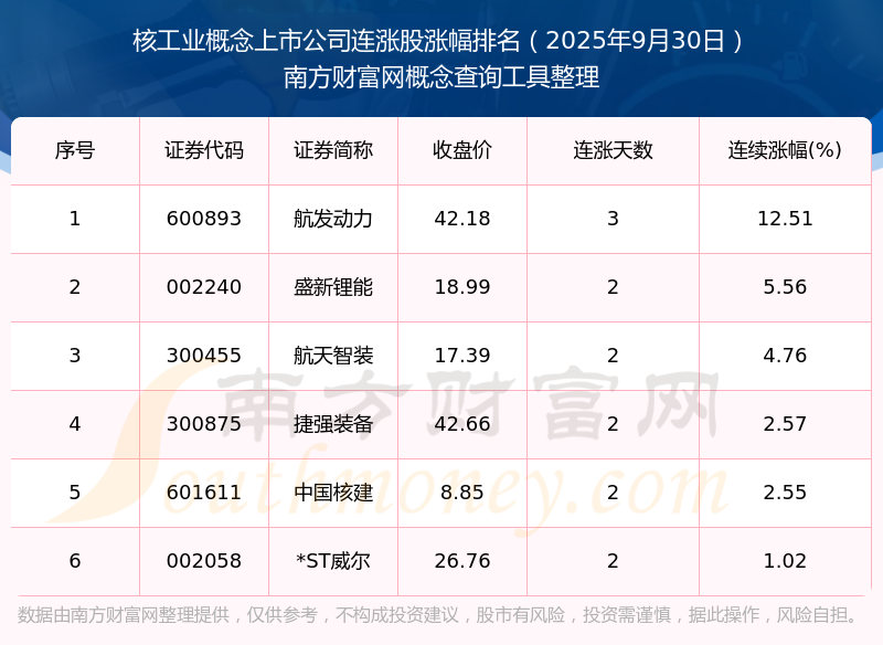 2025年9月30日核工業(yè)概念上市公司連漲股漲幅排名