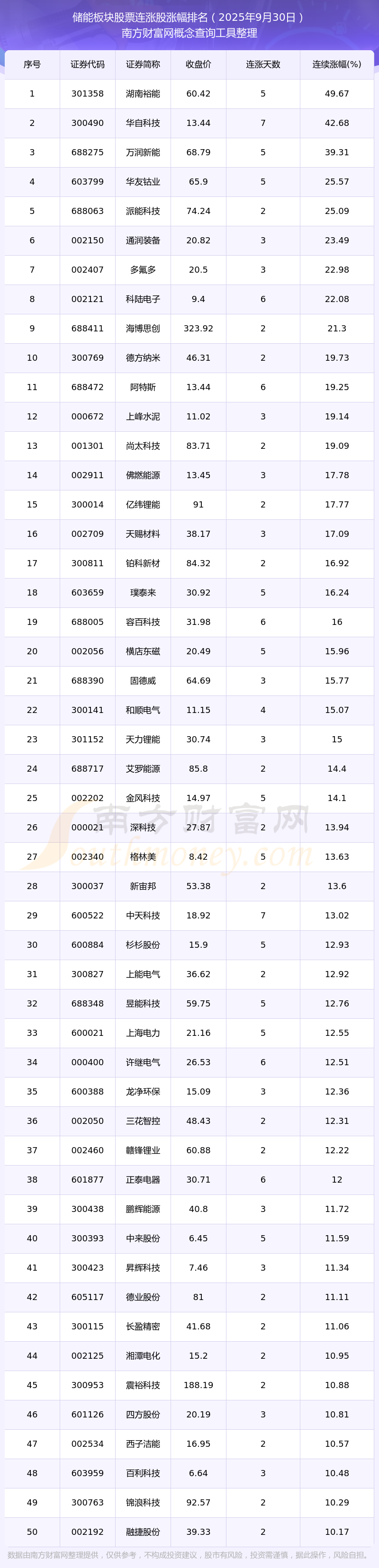 根據(jù)南方財(cái)富網(wǎng)概念查詢工具數(shù)據(jù)統(tǒng)計(jì),截止2025年9月30日收盤,儲(chǔ)能板塊股票共有216只個(gè)股實(shí)現(xiàn)連漲。其中連續(xù)漲幅較大的個(gè)股有湖南裕能、華自科技、萬潤新能等,連續(xù)漲幅分別為49.67%、42.68%、39.31%。