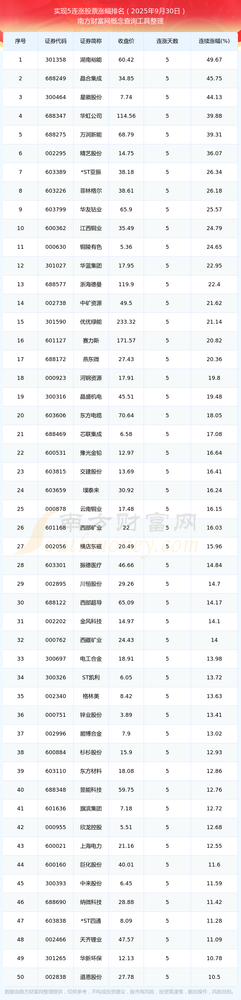 今日股市連漲股有哪些?實(shí)現(xiàn)6連漲個(gè)股有這些。2025年9月30日)