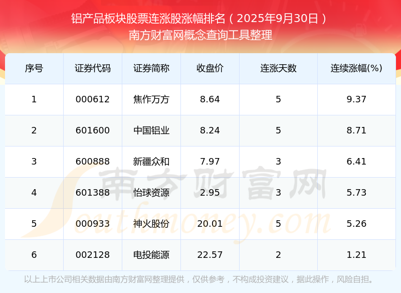 2025年9月30日鋁產(chǎn)品板塊股票連漲股票漲幅排名