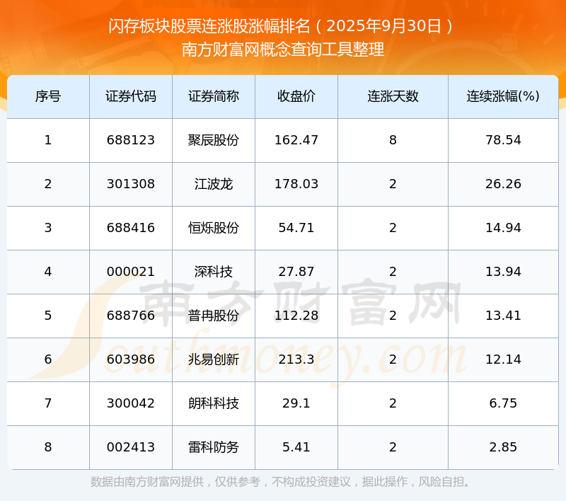 根據(jù)南方財(cái)富網(wǎng)概念查詢工具數(shù)據(jù)統(tǒng)計(jì),截止2025年9月30日收盤,閃存板塊股票共有8只個股實(shí)現(xiàn)連漲。其中連續(xù)漲幅較大的個股有聚辰股份、江波龍、恒爍股份等,連續(xù)漲幅分別為78.54%、26.26%、14.94%。