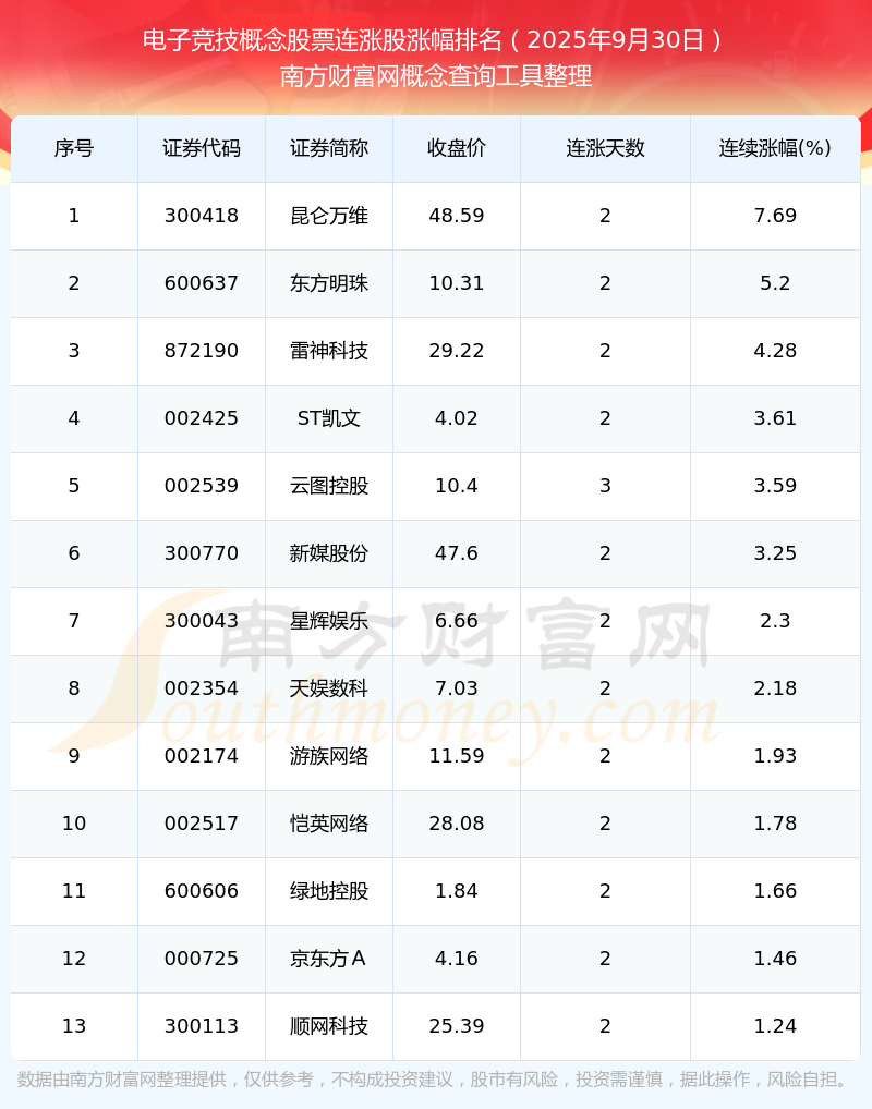 2025年9月30日電子競技概念股票連漲股漲幅排名