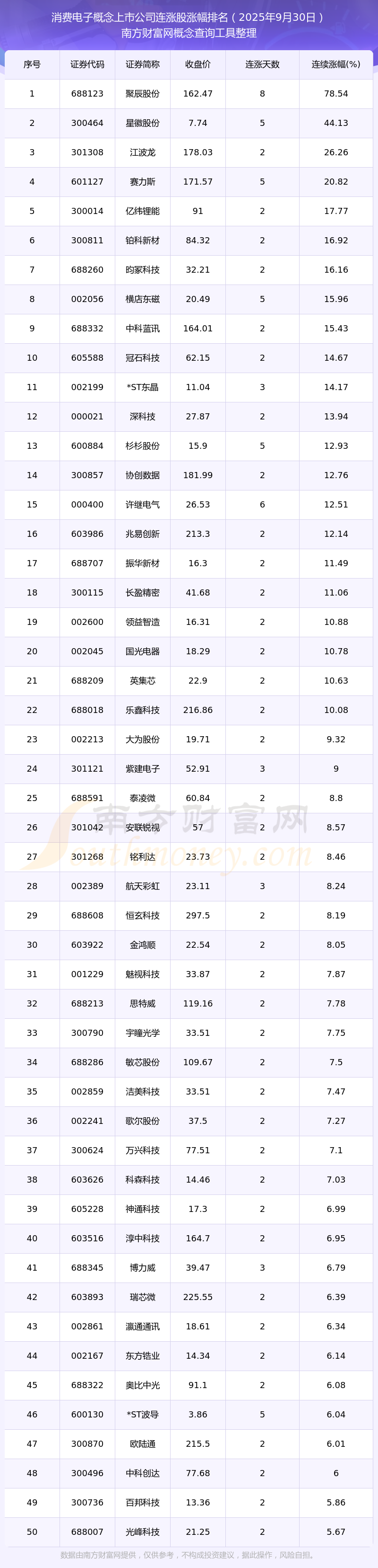 2025年9月30日消費(fèi)電子概念上市公司連漲股漲幅排名