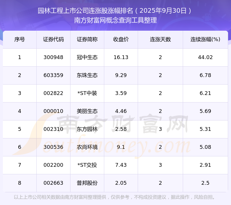 2025年9月30日園林工程上市公司連漲股漲幅排名