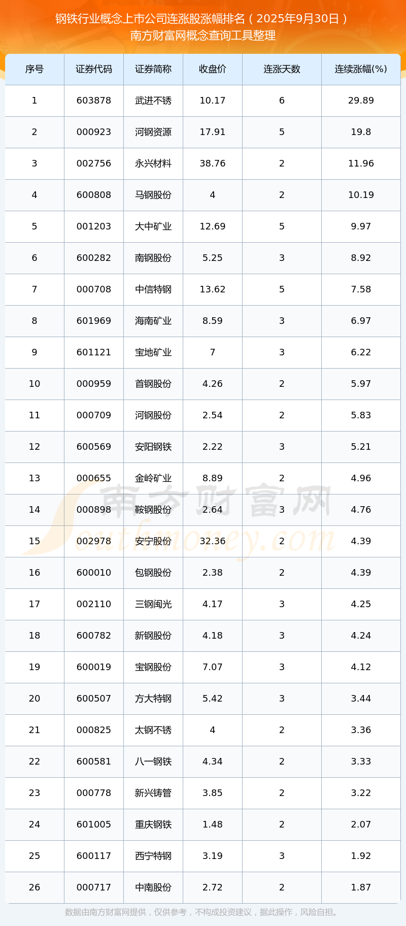 2025年9月30日鋼鐵行業(yè)概念上市公司連漲股票漲幅排名