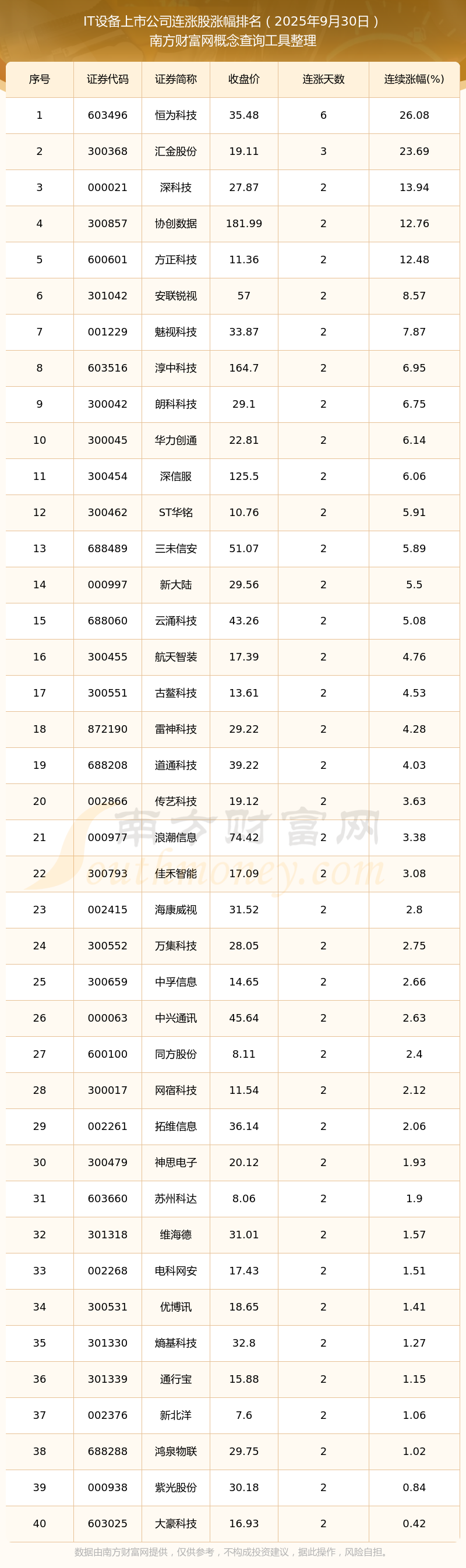 2025年9月30日IT設(shè)備上市公司連漲股漲幅排名